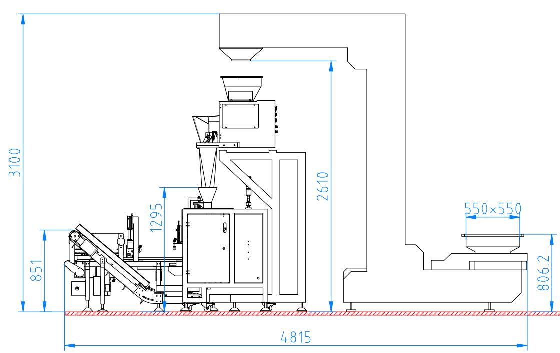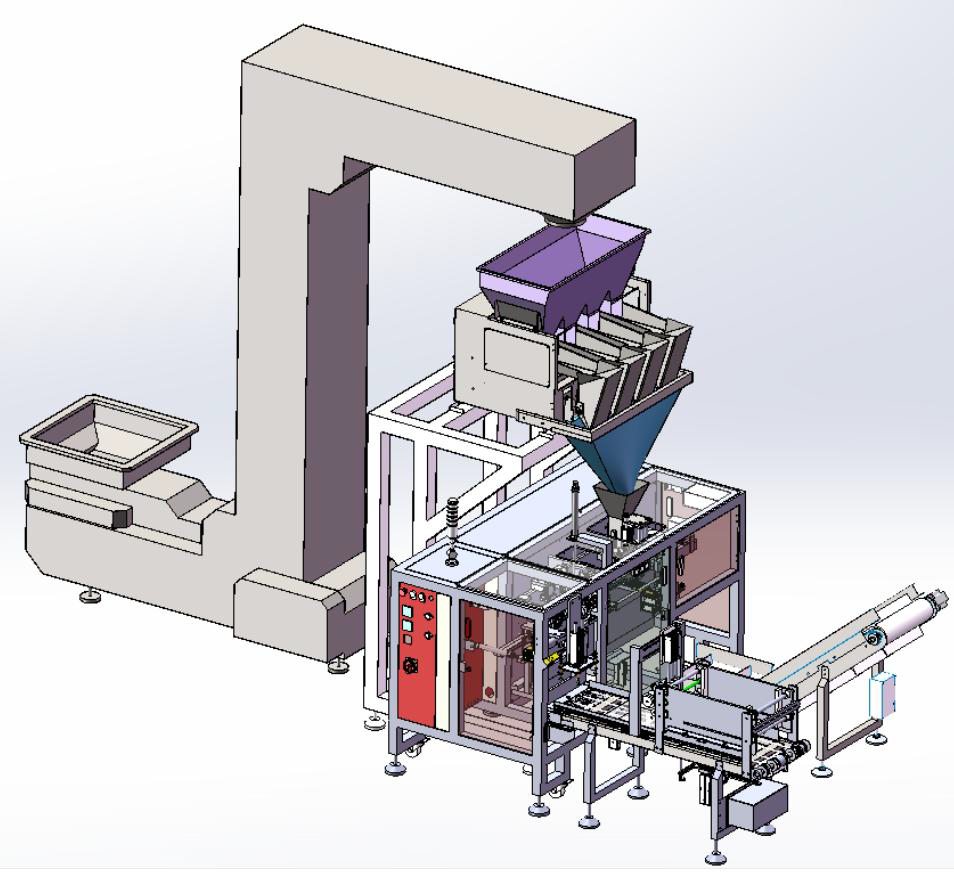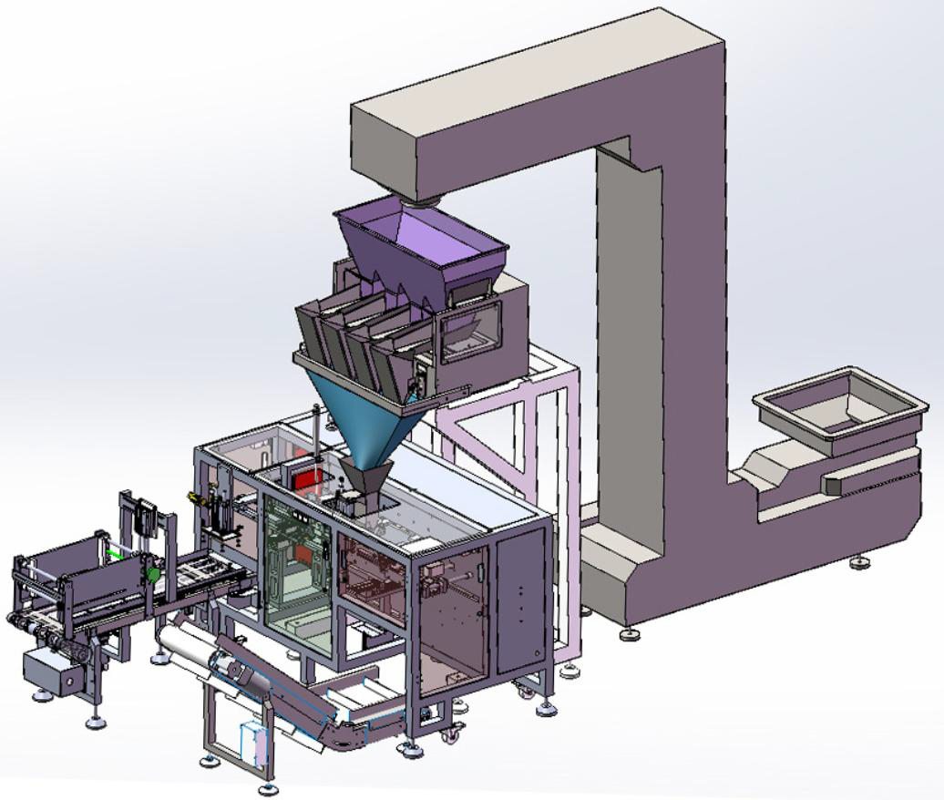 Maszyny typu premade pouch / doypack to najlepsze rozwiązanie, gdy chcesz pakować produkt w estetyczne, gotowe torebki (np. doypack ze struną), bez formowania opakowania z rolki folii. Urządzenie automatycznie pobiera torebkę z magazynku, otwiera ją, napełnia odważoną porcją, a następnie wykonuje zgrzew i wyprowadza gotową paczkę na odbiór. W poniższej konfiguracji system został dobrany pod pakowanie w porcjach 50-1000 [g] torebki zipper pouch.
