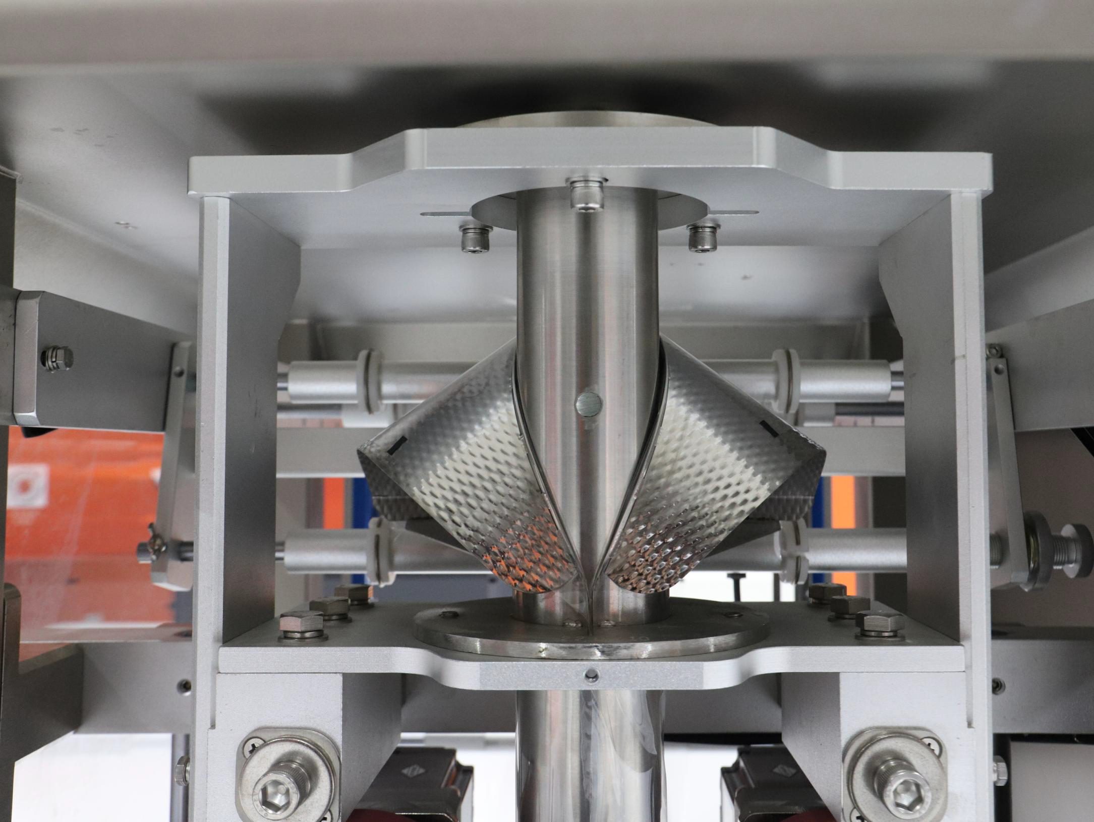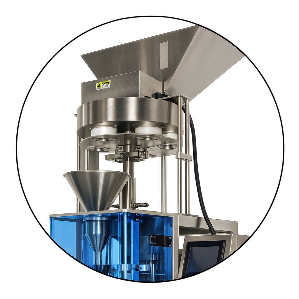 Zasada działania: System opiera się na zastosowaniu cylindrycznych kubków lub komór o określonej, regulowanej objętości. Podczas procesu pakowania produkt trafia do kubków dozujących, które po napełnieniu opróżniane są do opakowania. Dzięki mechanicznej regulacji pojemności kubków możliwe jest dostosowanie dozowanej ilości produktu do wymagań klienta.