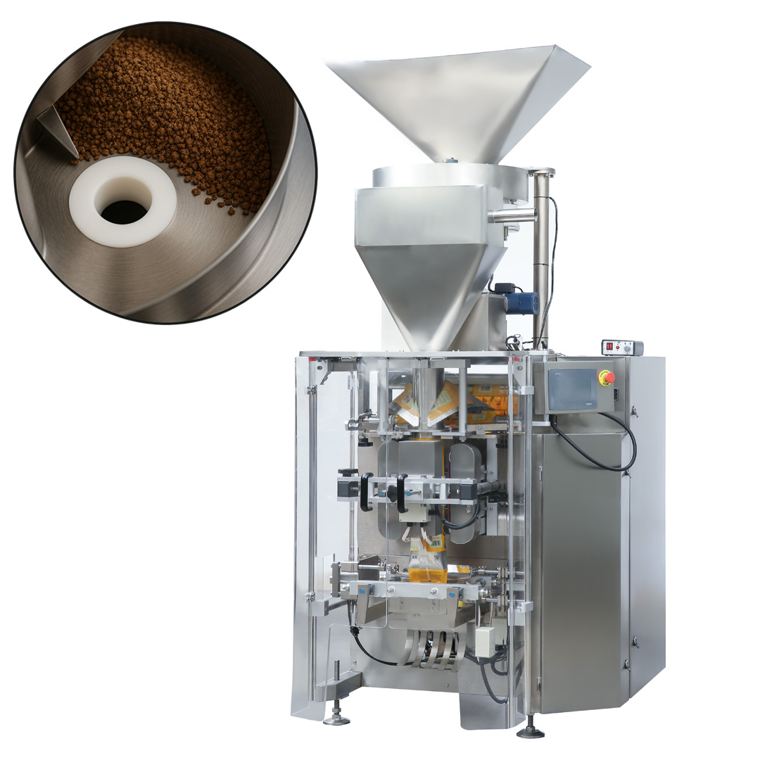 Pionowa maszyna pakująca VC-320 to maszyna wyposazona w system dozowania objętościowego. System objętościowy to jedno z najprostszych i najwydajniejszych rozwiązań dozujących, stosowane w maszynach pakujących. Jest idealny do precyzyjnego odmierzania produktów sypkich oraz granulowanychtakich jak np. cukier, sól, przyprawy itp.