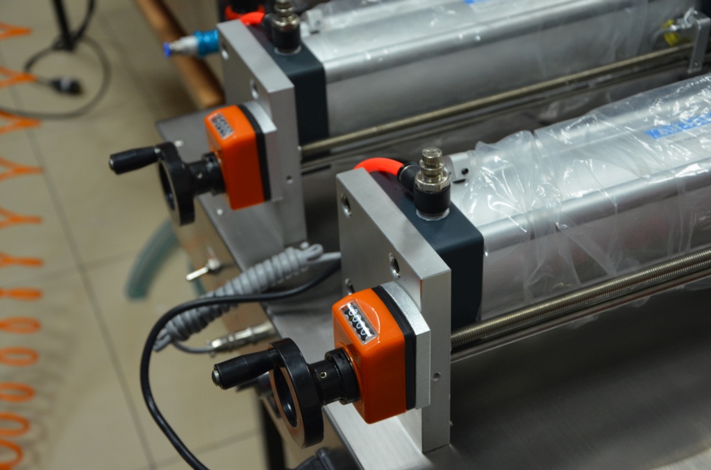 Za pomocą pokrętła zmiany dozy umieszczonego za siłownikiem. Pokrętłem regulujemy wysuw siłownika i tym samym zmieniamy zakres dozy. W przypadku maszyny w dozie 100-1000ml i chęci ustawienia dozy 500ml, czujnik musi zostać umieszczony mniej więcej w połowie zakresu. Po nastawie, wykonujemy cykl nalewania i ważymy butelkę. Czynność powtarzamy do uzyskania idealnej żądanej dozy.
