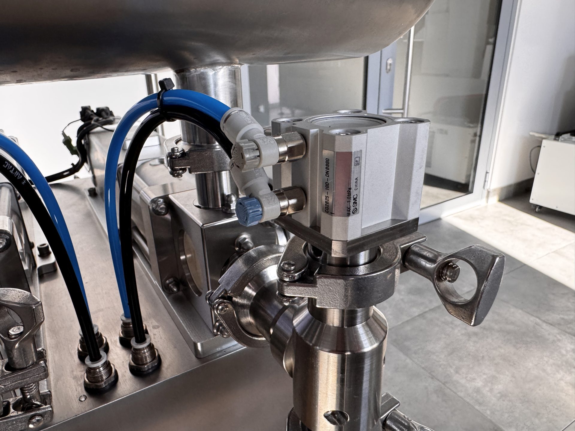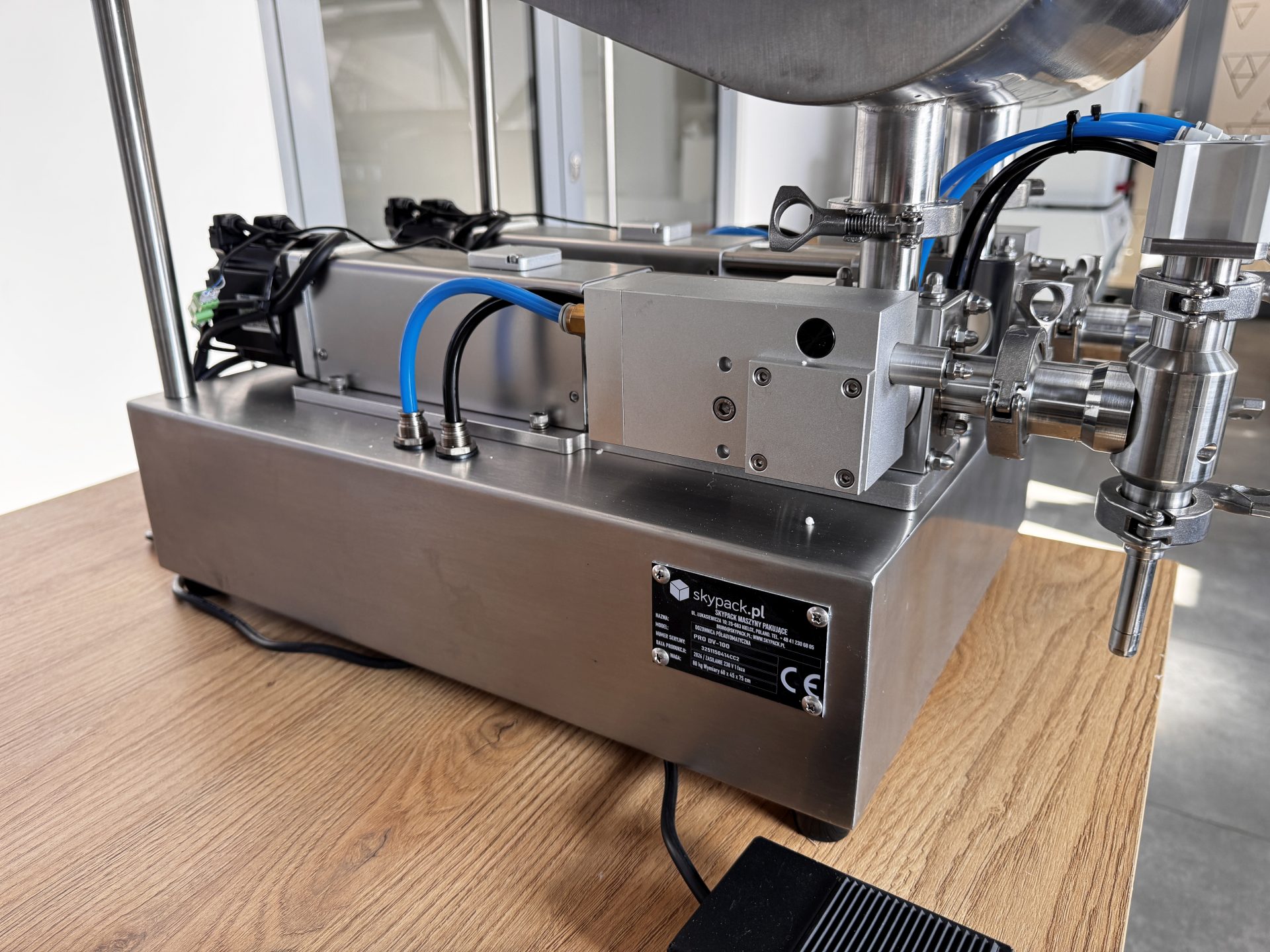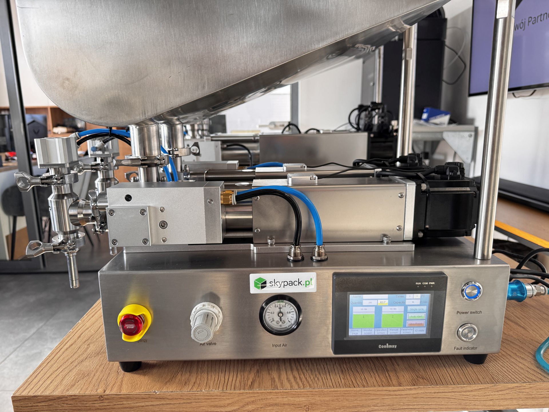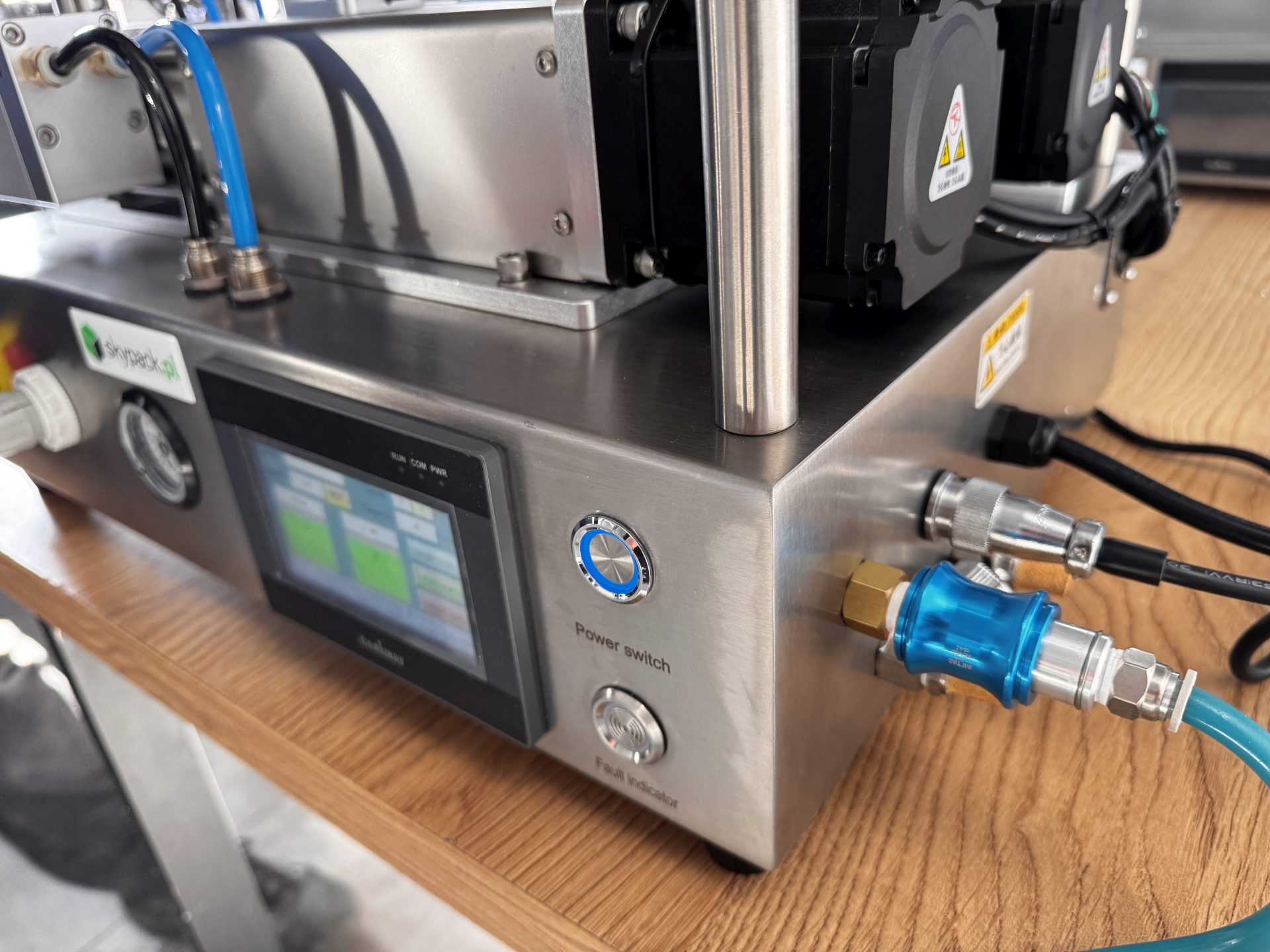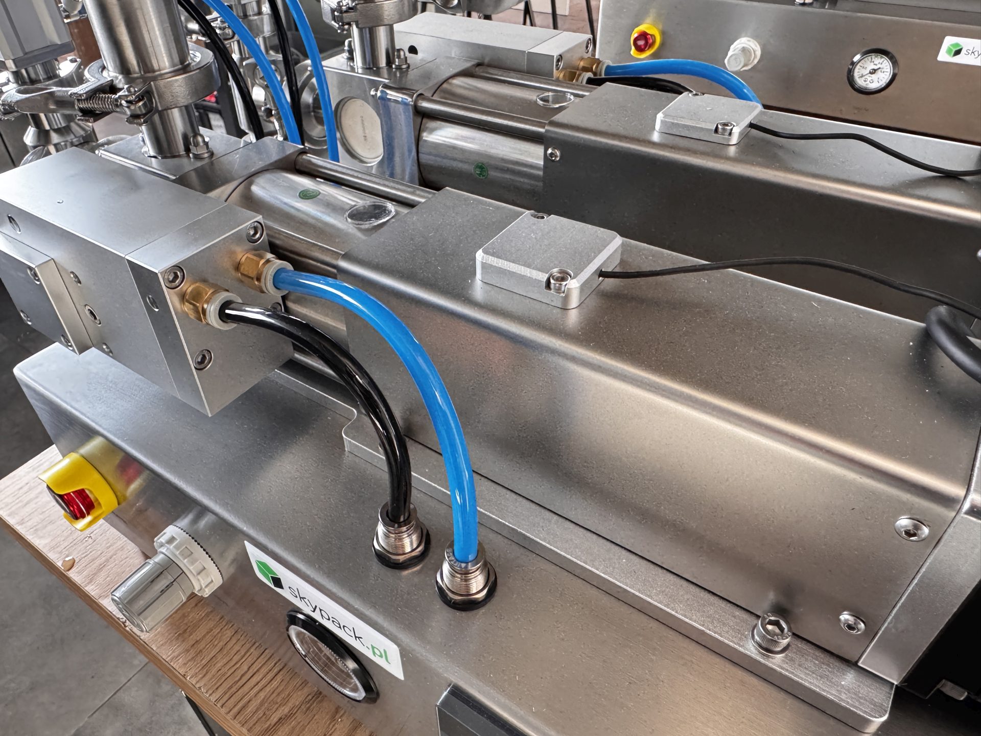 Maszyna została wyposażona w japońskie siłowniki pneumatyczne SMC, stosowane w napędach kluczowych mechanizmów: cyklu tłoków dozujących, odcięcia Anti-Drop, podnoszenia głowicy nalewającej oraz pozycjonowania opakowań. Dzięki temu układ pracuje płynnie i powtarzalnie, co przekłada się na stabilną dawkę, czystsze nalewanie oraz mniejszą awaryjność przy intensywnej eksploatacji.