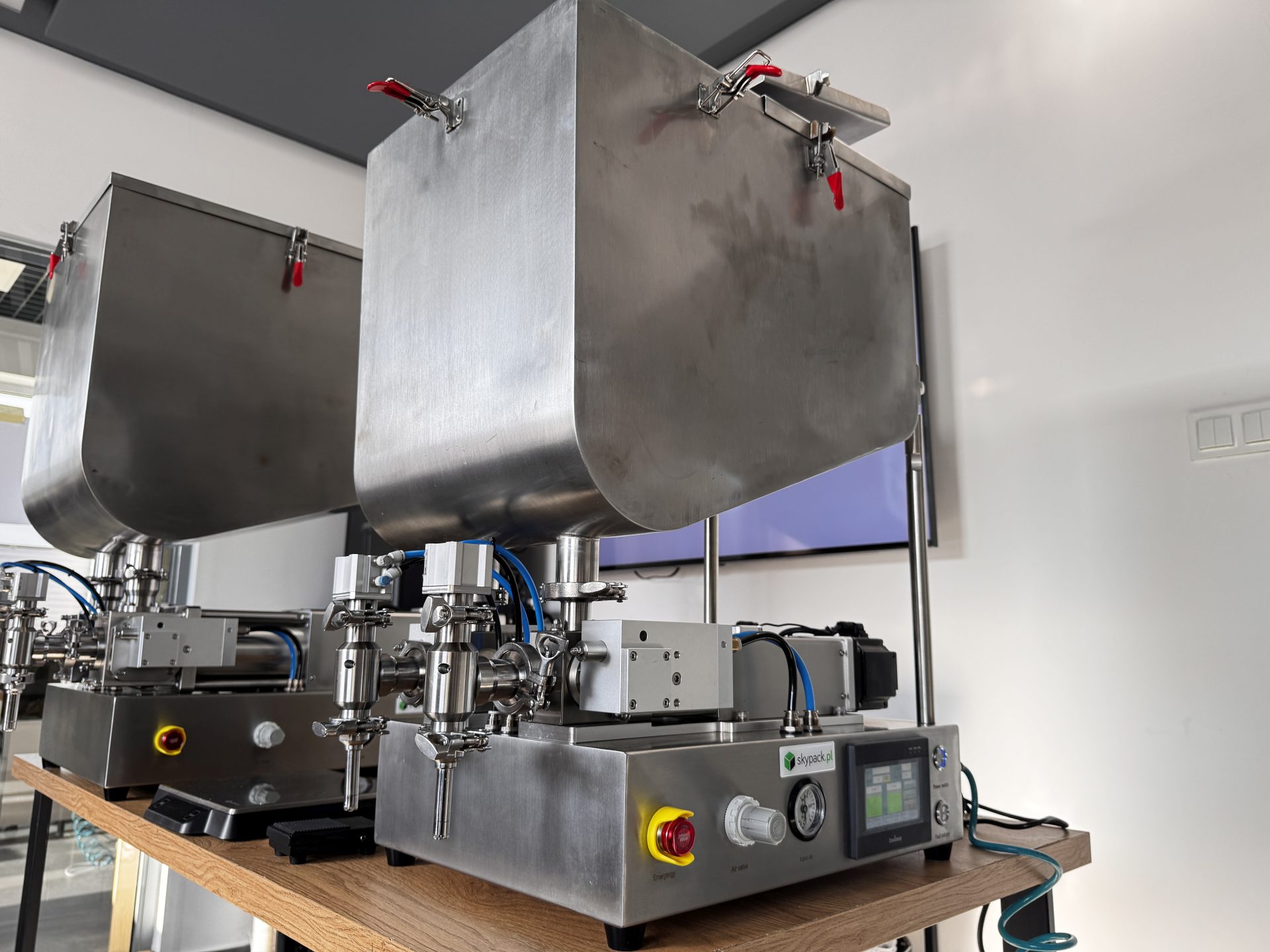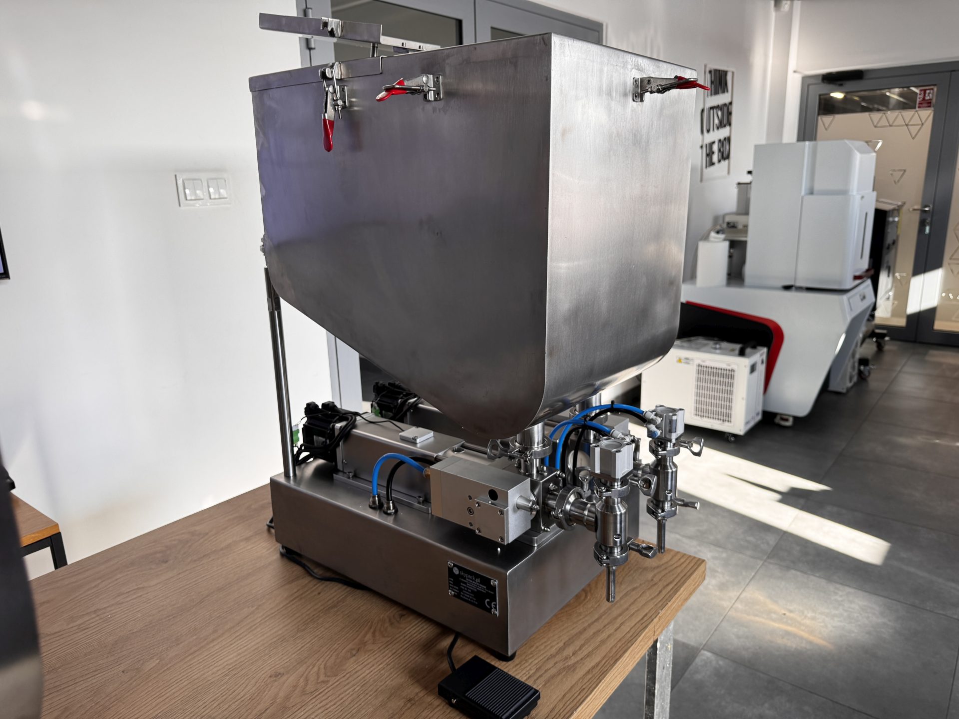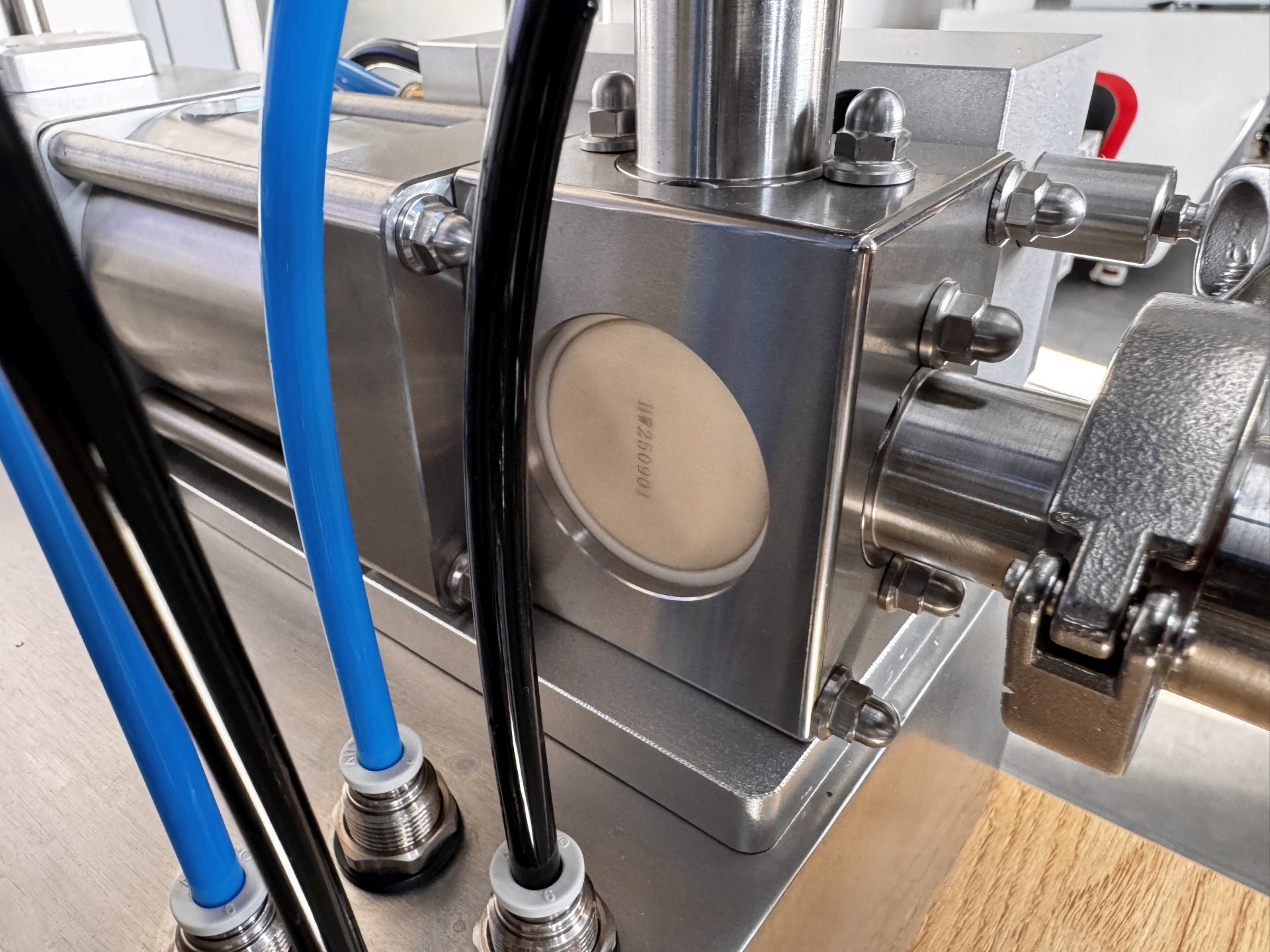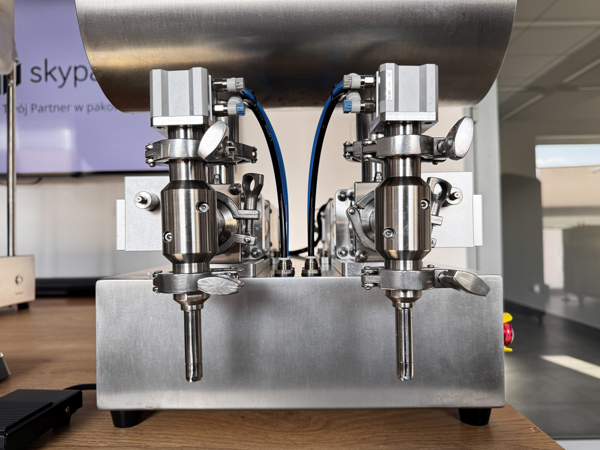 Maszyna została wyposażona w japońskie siłowniki pneumatyczne SMC, stosowane w napędach kluczowych mechanizmów: cyklu tłoków dozujących, odcięcia Anti-Drop, podnoszenia głowicy nalewającej oraz pozycjonowania opakowań. Dzięki temu układ pracuje płynnie i powtarzalnie, co przekłada się na stabilną dawkę, czystsze nalewanie oraz mniejszą awaryjność przy intensywnej eksploatacji.