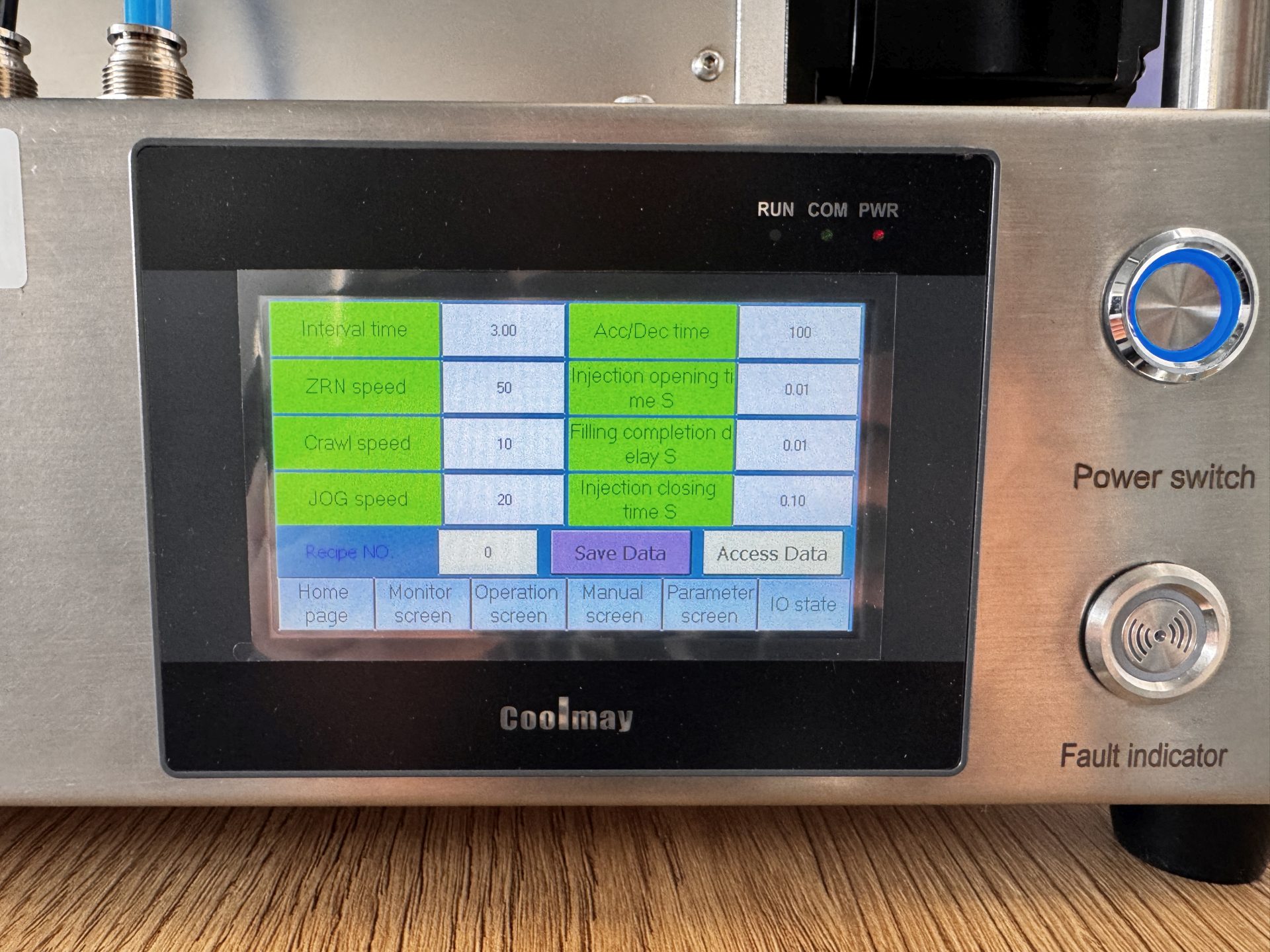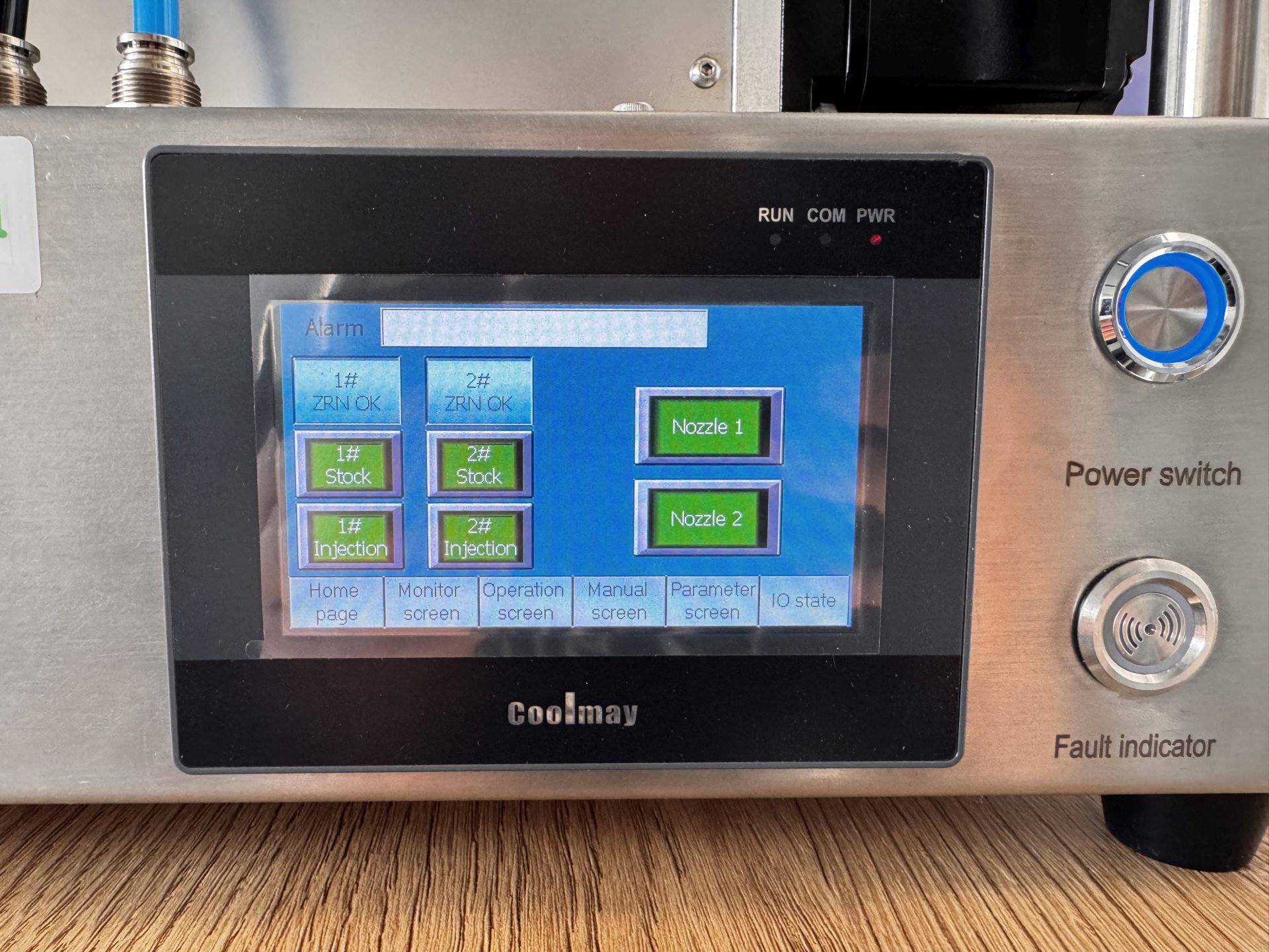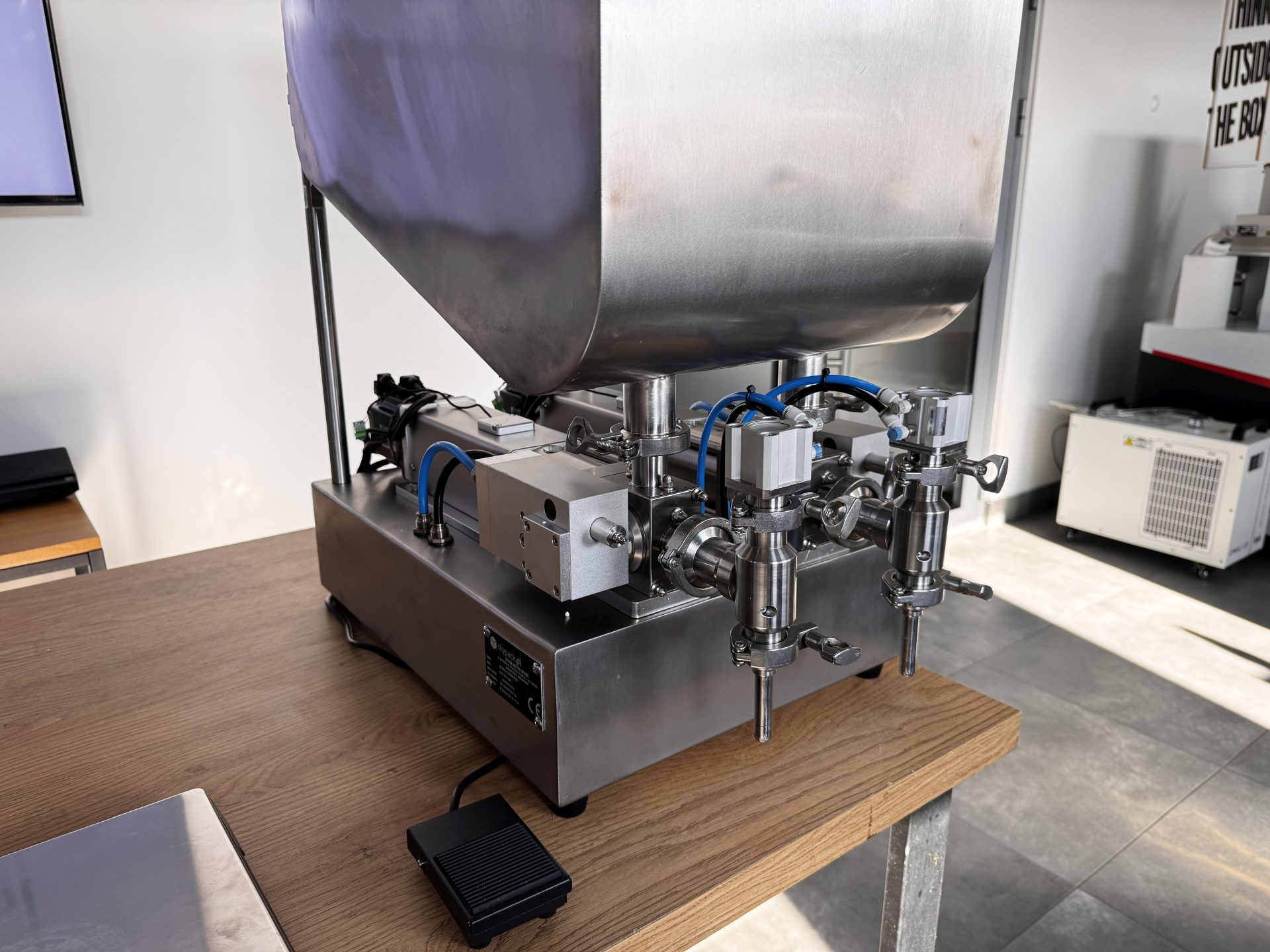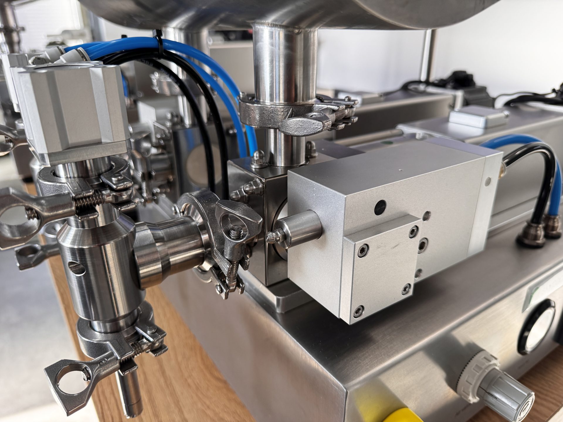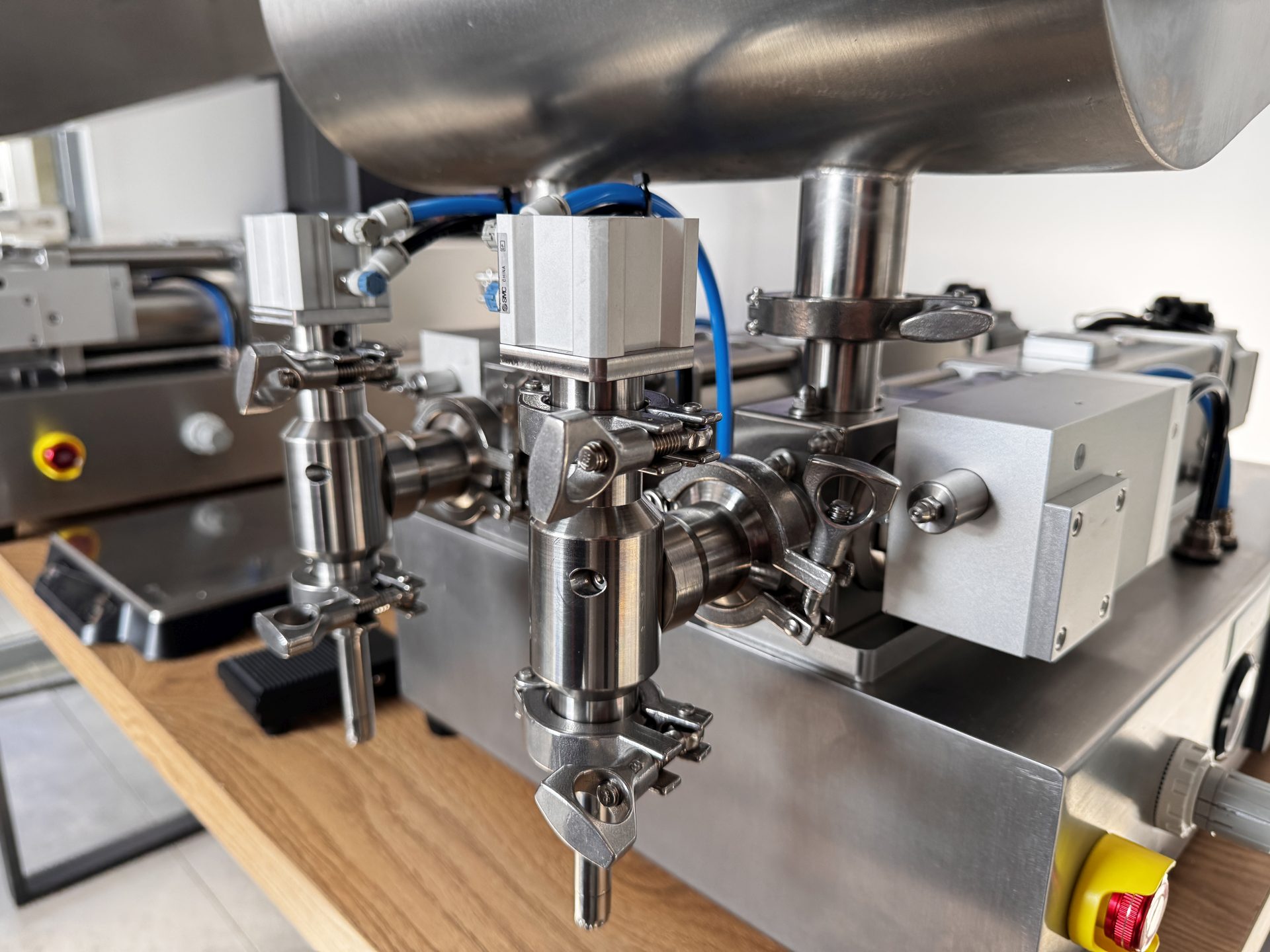 Maszyna została wyposażona w japońskie siłowniki pneumatyczne SMC, stosowane w napędach kluczowych mechanizmów: cyklu tłoków dozujących, odcięcia Anti-Drop, podnoszenia głowicy nalewającej oraz pozycjonowania opakowań. Dzięki temu układ pracuje płynnie i powtarzalnie, co przekłada się na stabilną dawkę, czystsze nalewanie oraz mniejszą awaryjność przy intensywnej eksploatacji.