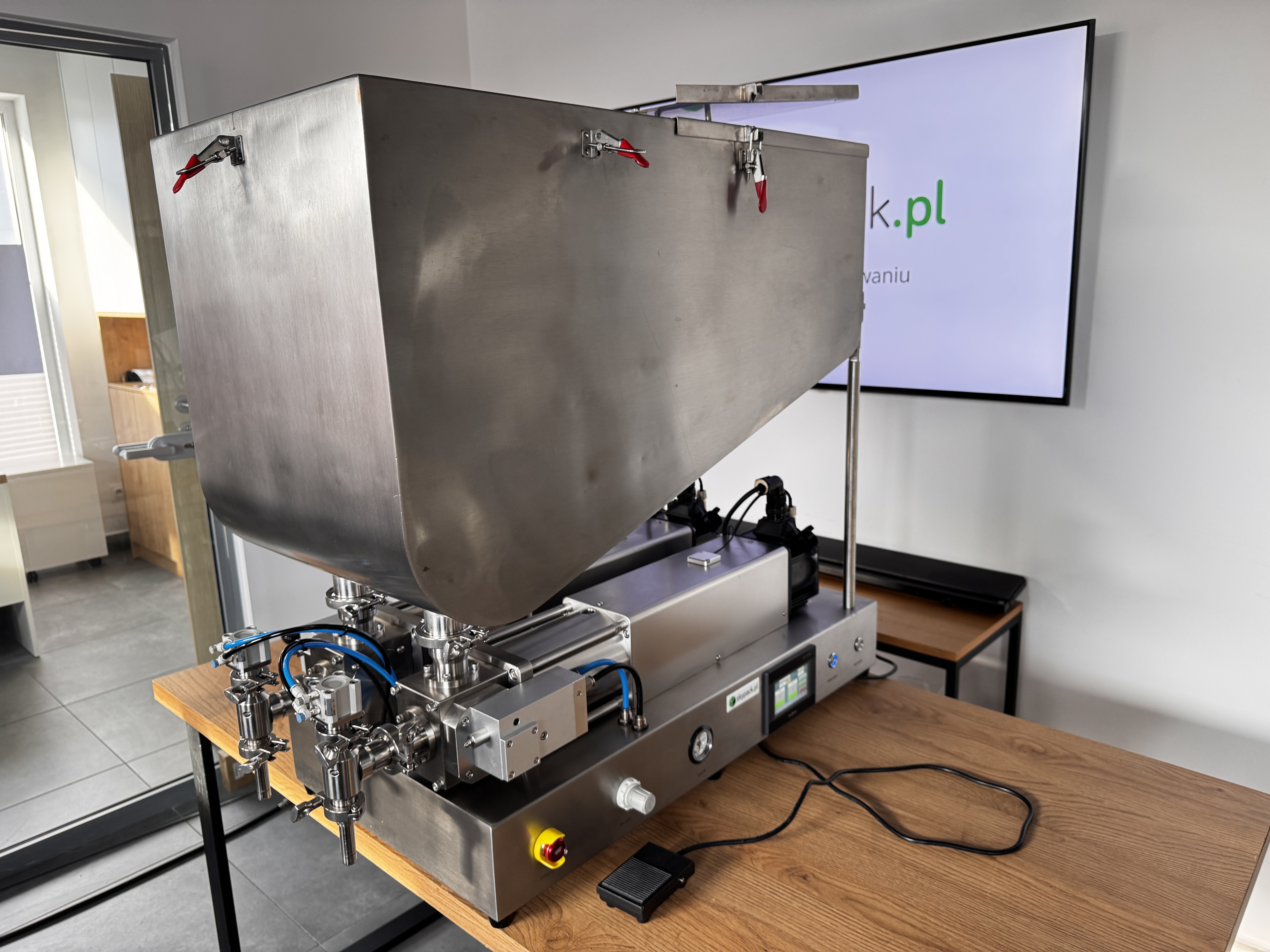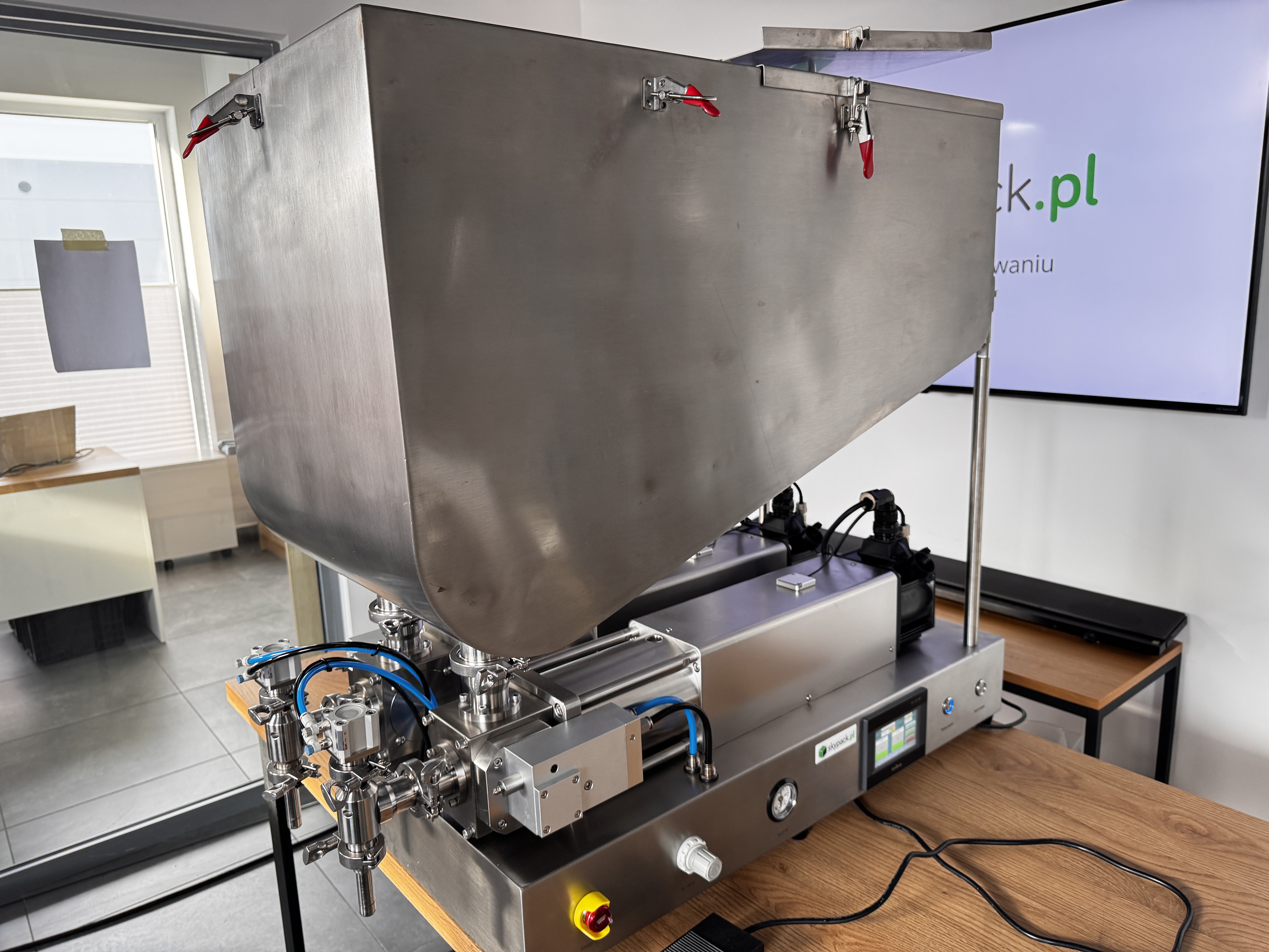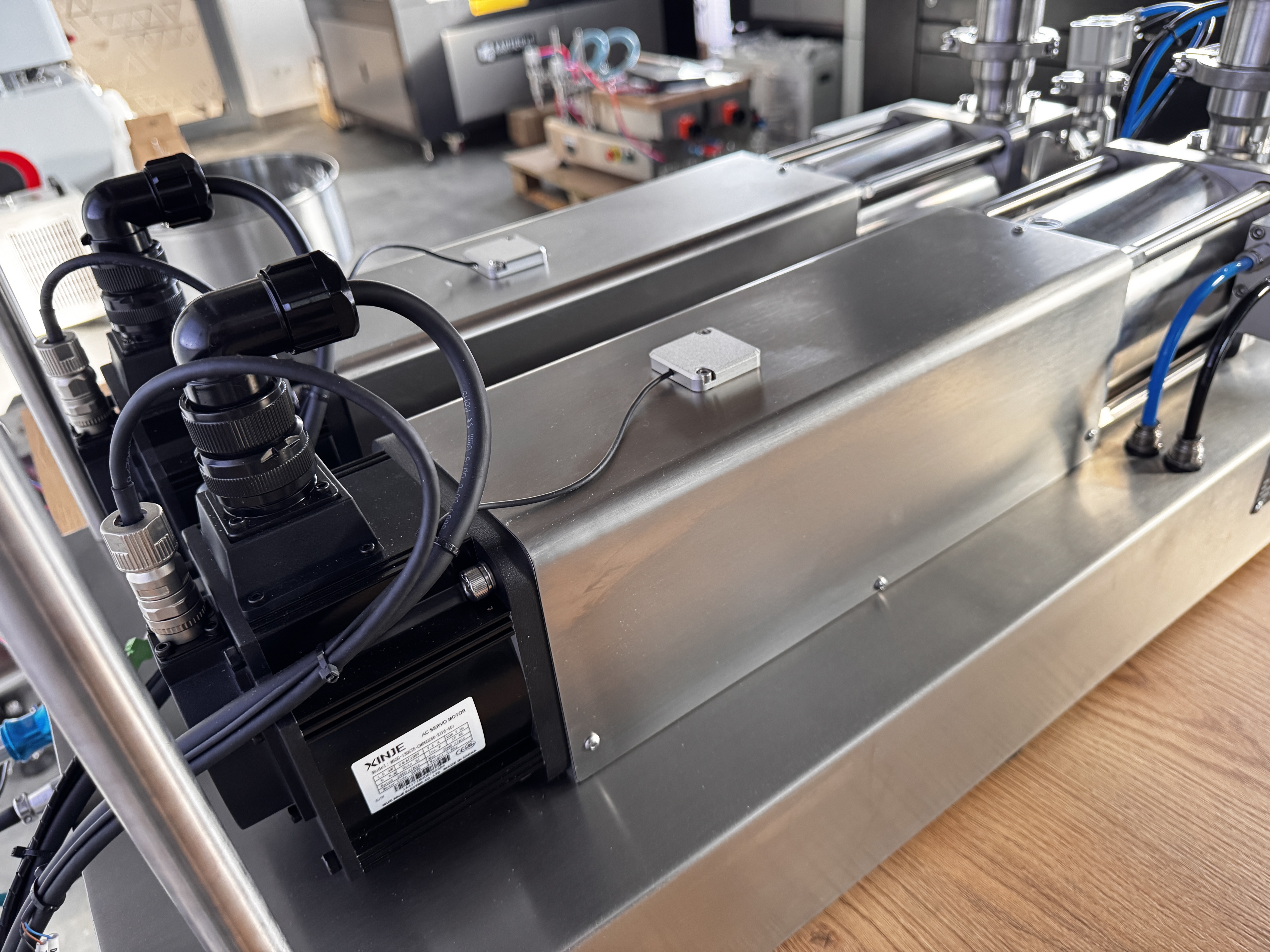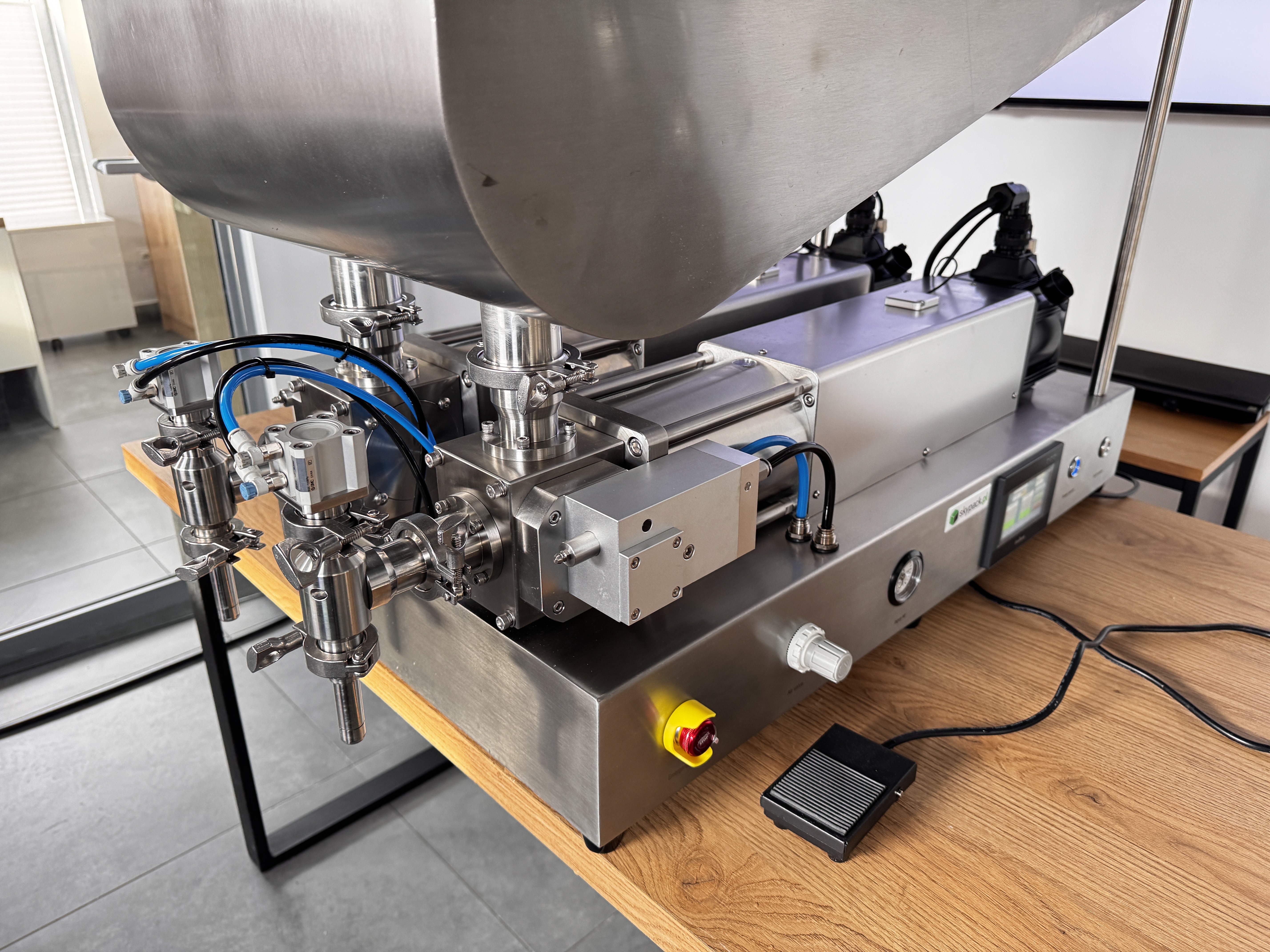 Maszyna została wyposażona w japońskie siłowniki pneumatyczne SMC, stosowane w napędach kluczowych mechanizmów: cyklu tłoków dozujących, odcięcia Anti-Drop, podnoszenia głowicy nalewającej oraz pozycjonowania opakowań. Dzięki temu układ pracuje płynnie i powtarzalnie, co przekłada się na stabilną dawkę, czystsze nalewanie oraz mniejszą awaryjność przy intensywnej eksploatacji.