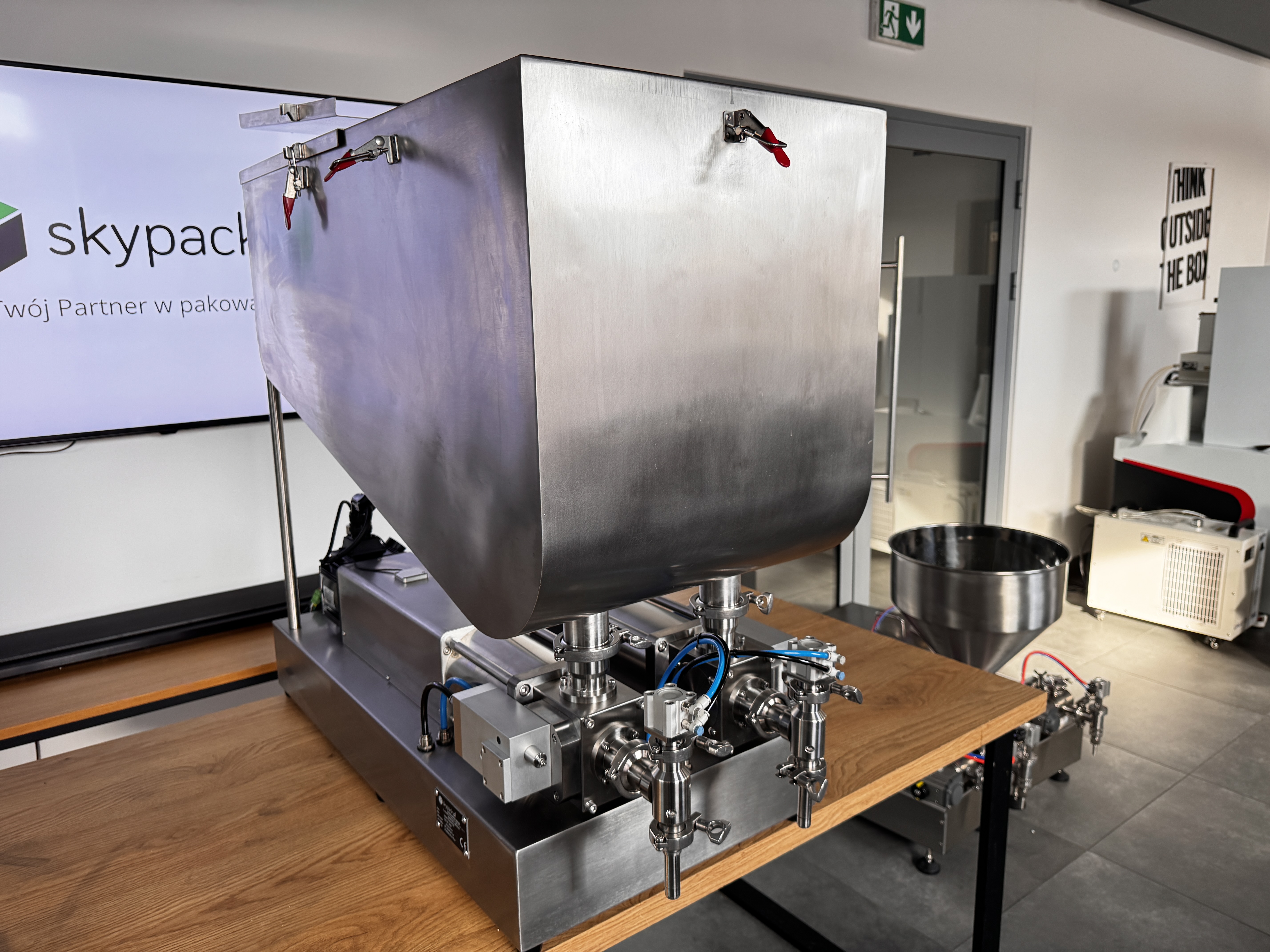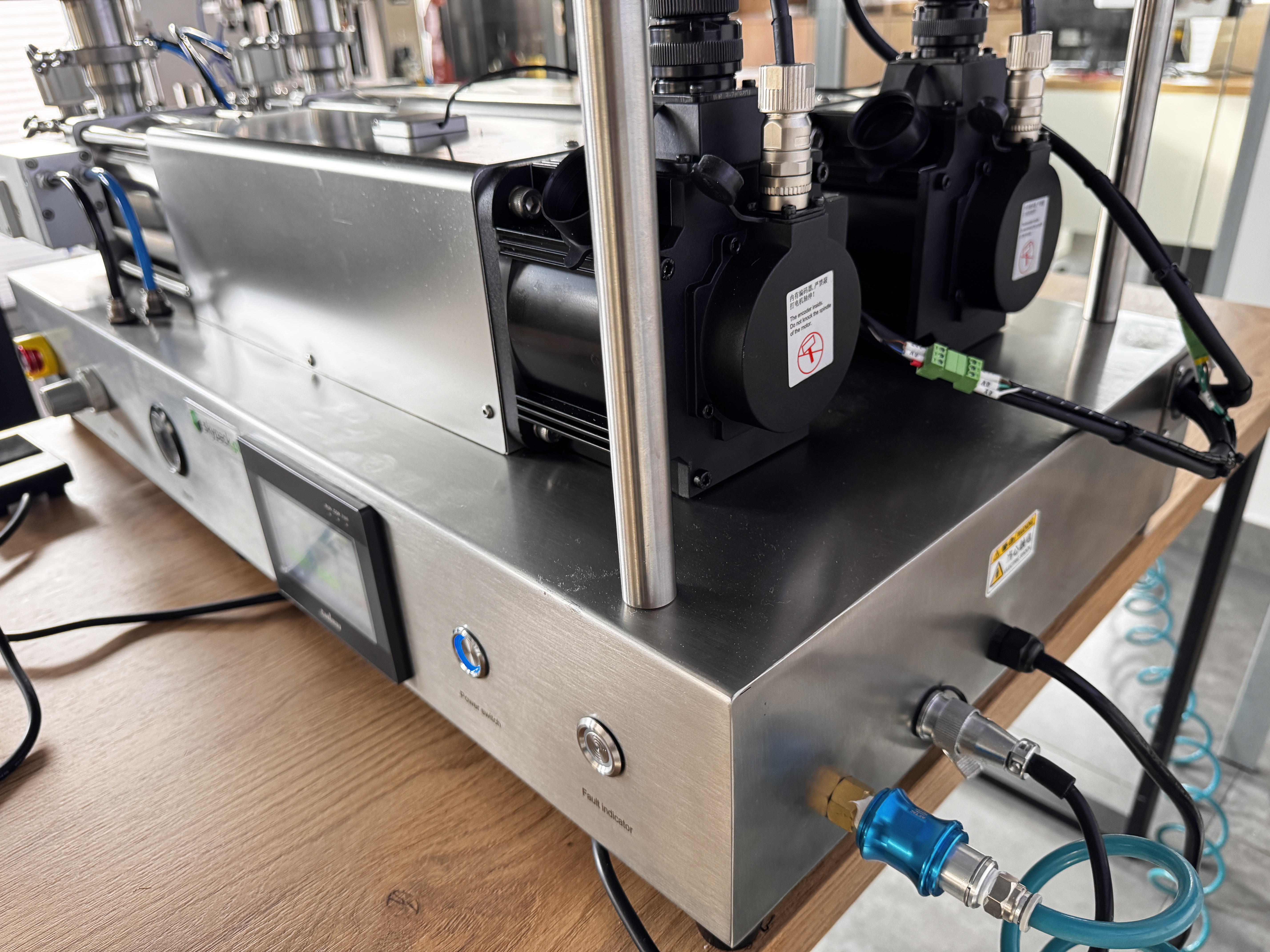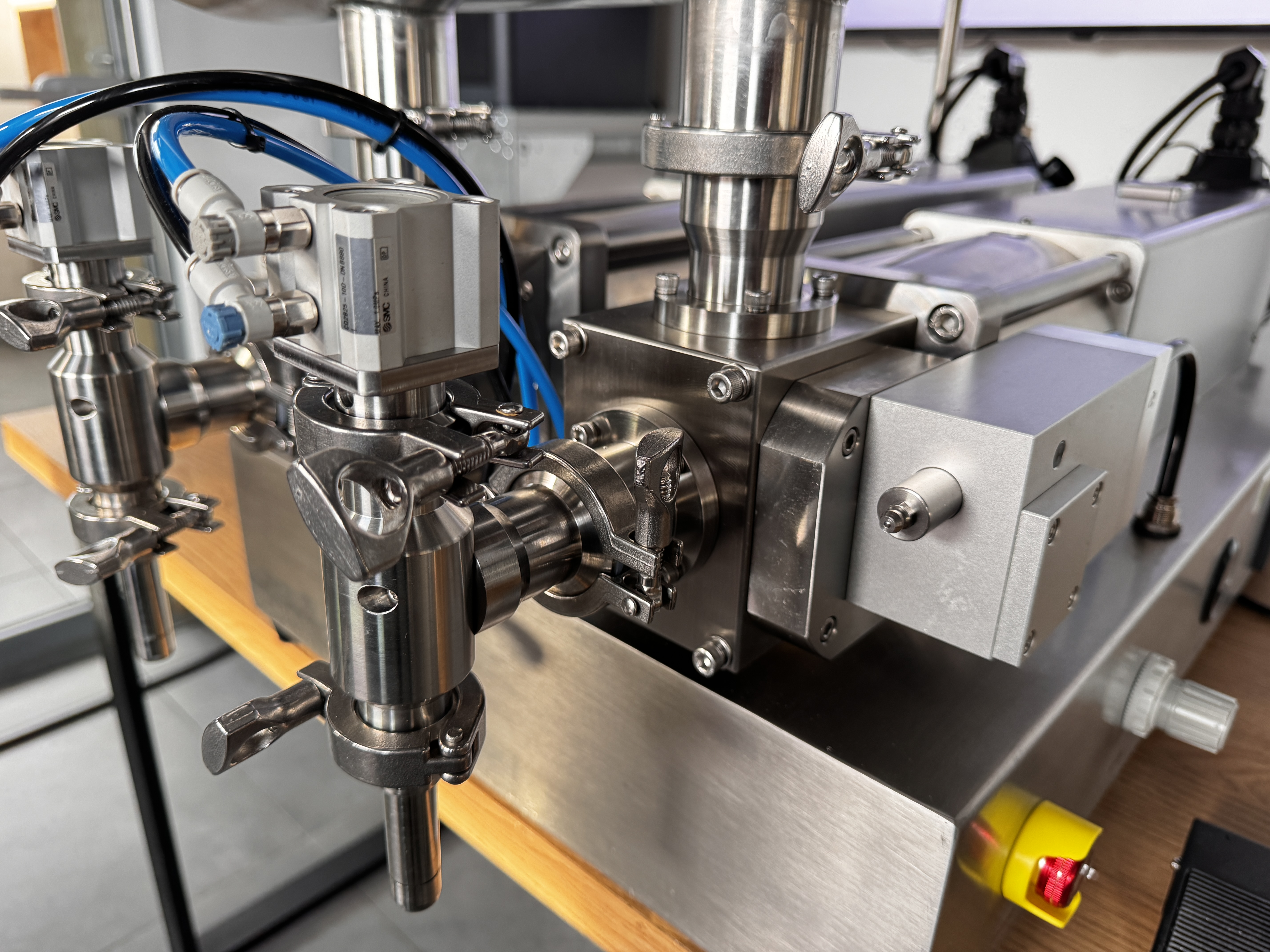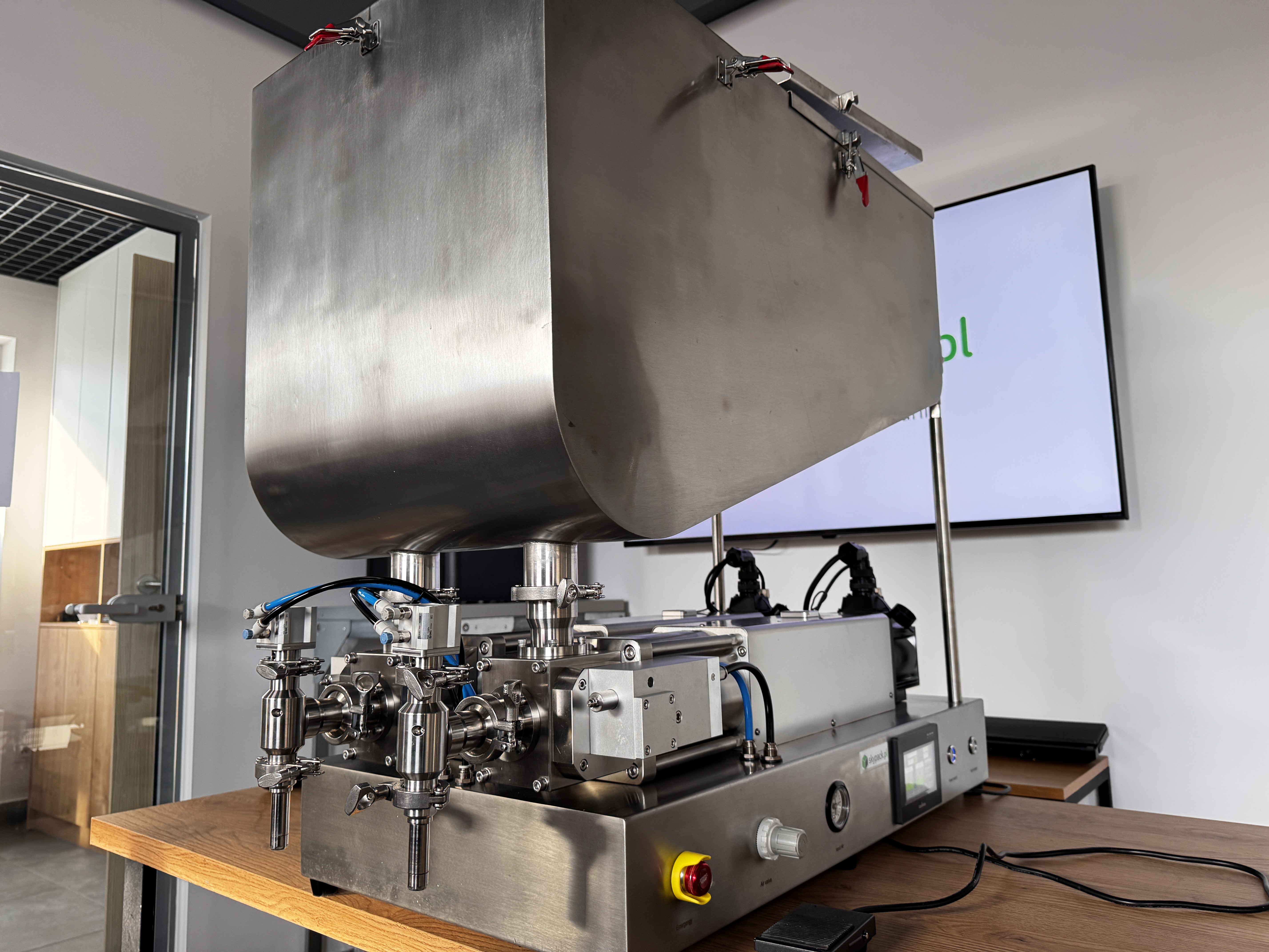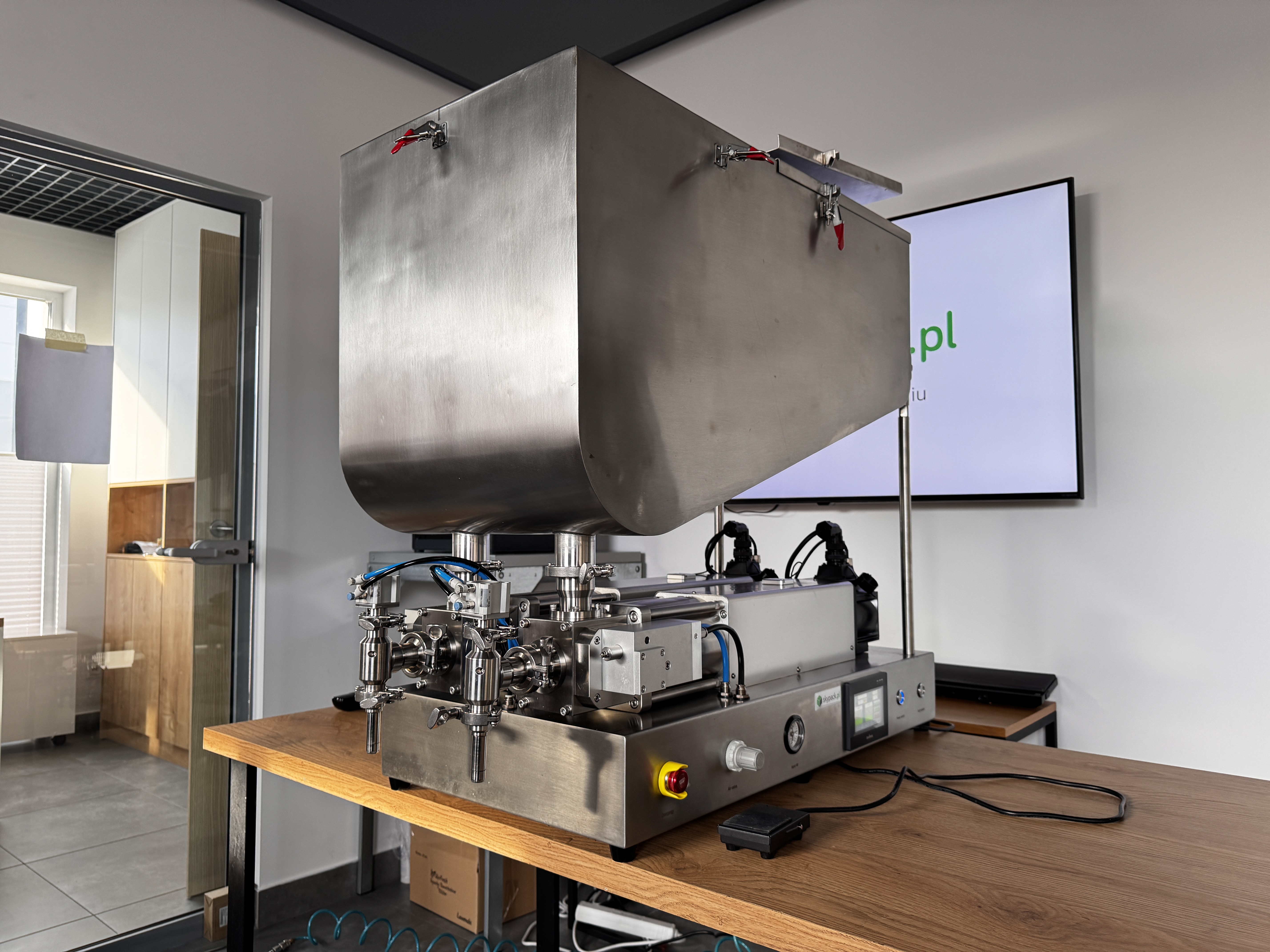 Maszyna została wyposażona w japońskie siłowniki pneumatyczne SMC, stosowane w napędach kluczowych mechanizmów: cyklu tłoków dozujących, odcięcia Anti-Drop, podnoszenia głowicy nalewającej oraz pozycjonowania opakowań. Dzięki temu układ pracuje płynnie i powtarzalnie, co przekłada się na stabilną dawkę, czystsze nalewanie oraz mniejszą awaryjność przy intensywnej eksploatacji.