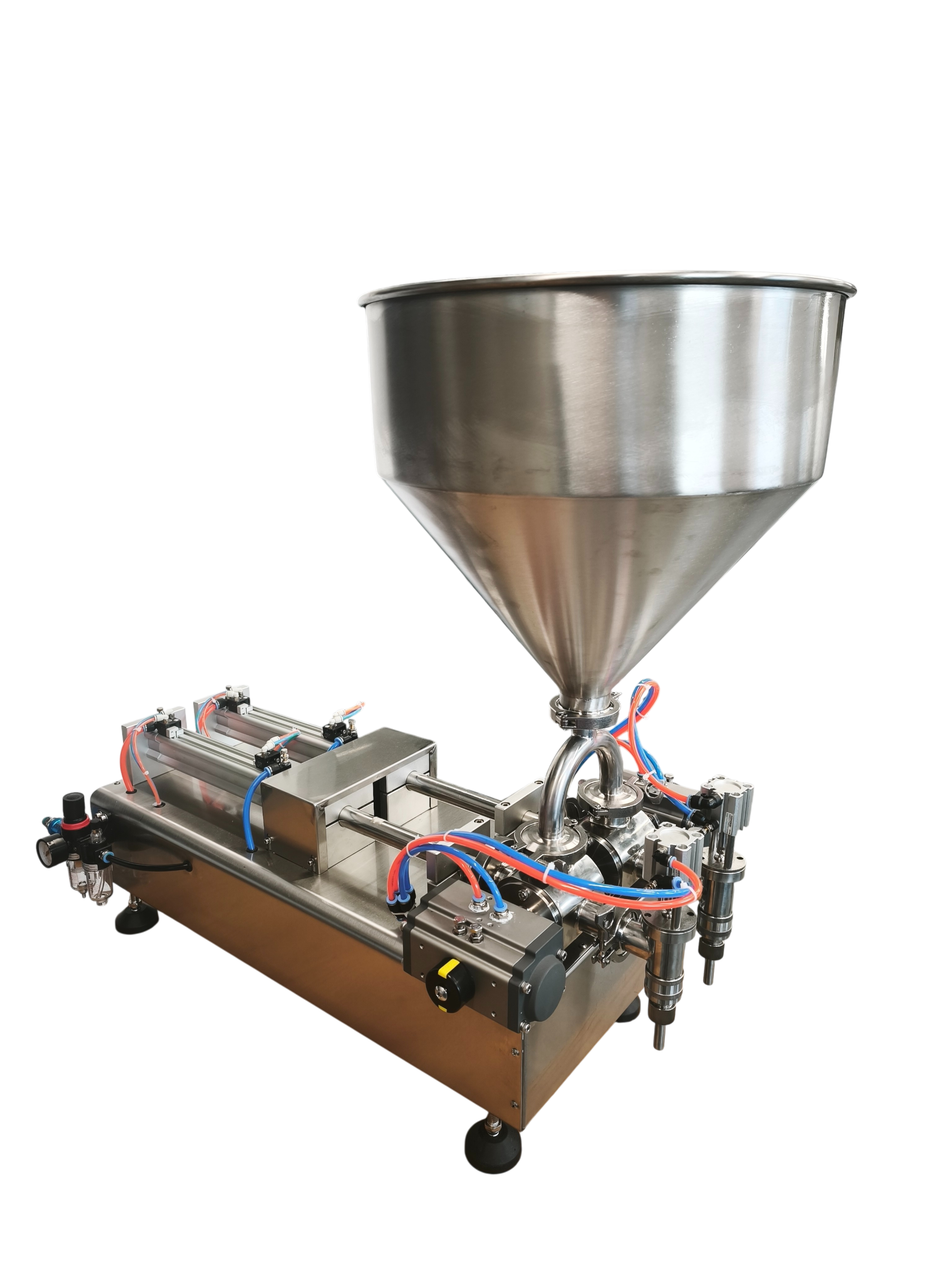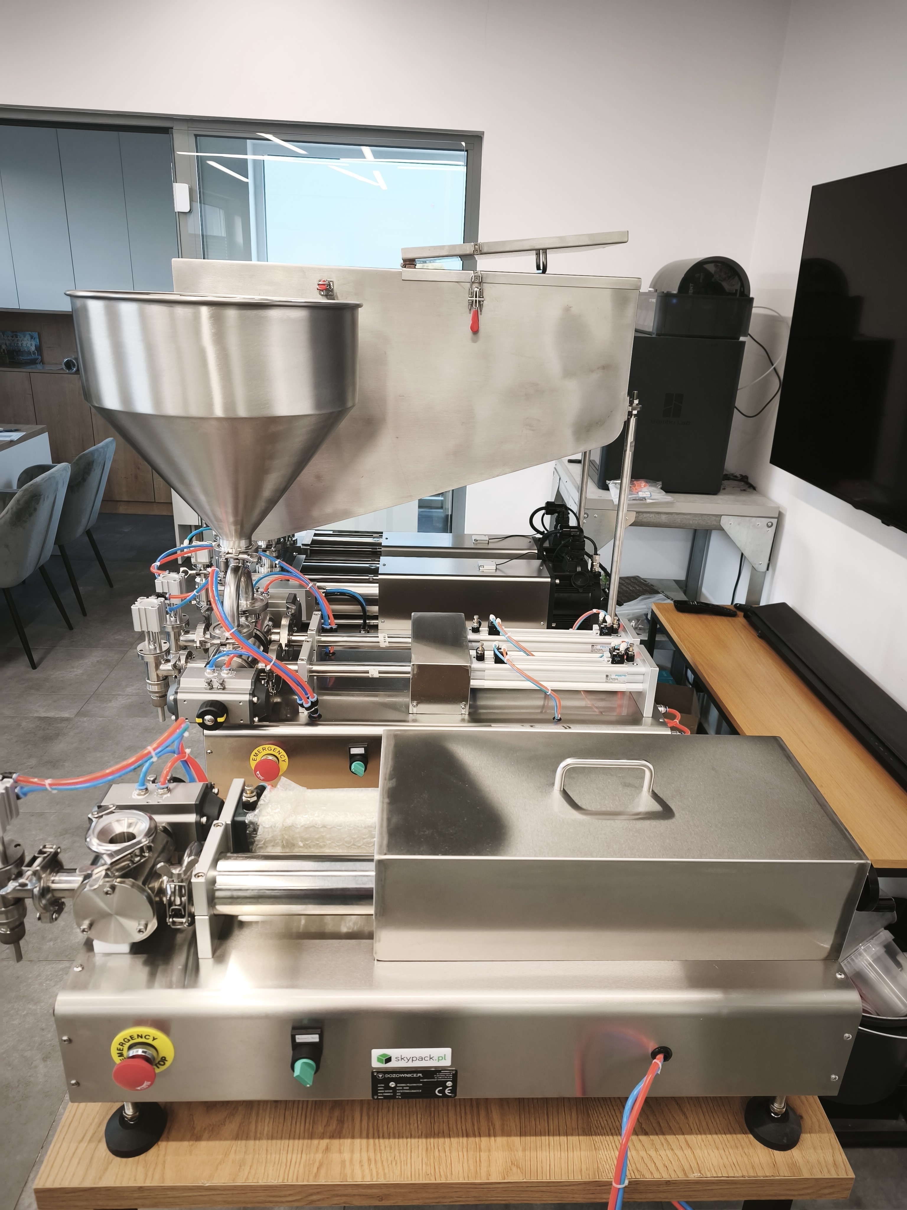 Tak. W tym wypadku maszynę musimy jedynie doposażyć o złączkę do podłaczenia rury fi 32mm lub fi 50mm. Taką rurą łączymy maszynę z zewnętrznym zbiornikiem. Prosimy tylko pamiętać, że przy produktach gęstych jak np. majonezy, ketchupy zbiornik taki musi być umieszczony wyżej aniżeli maszyna dozująca. Zapewniamy w ten sposób spływ grawitacyjny do maszyny.