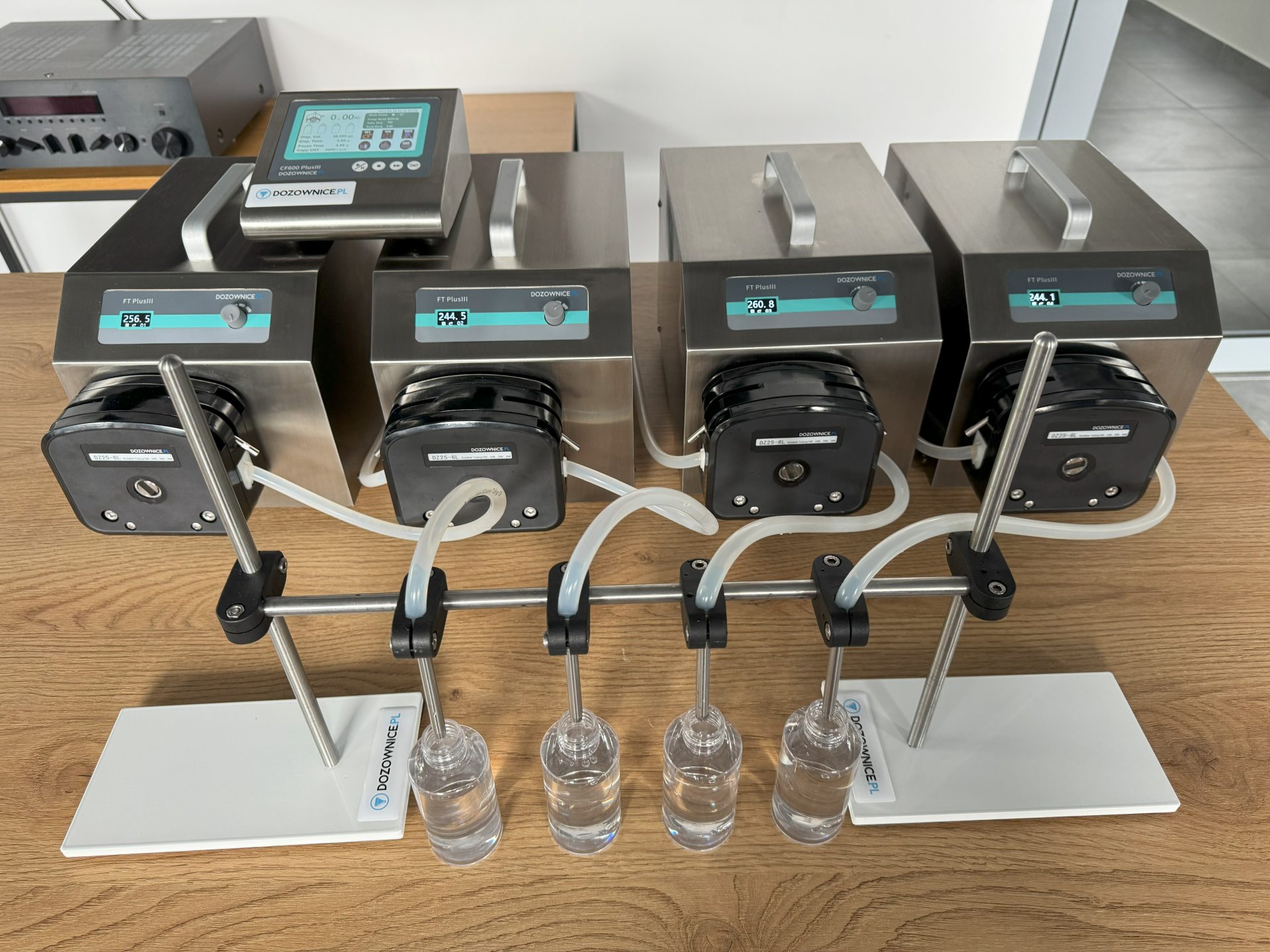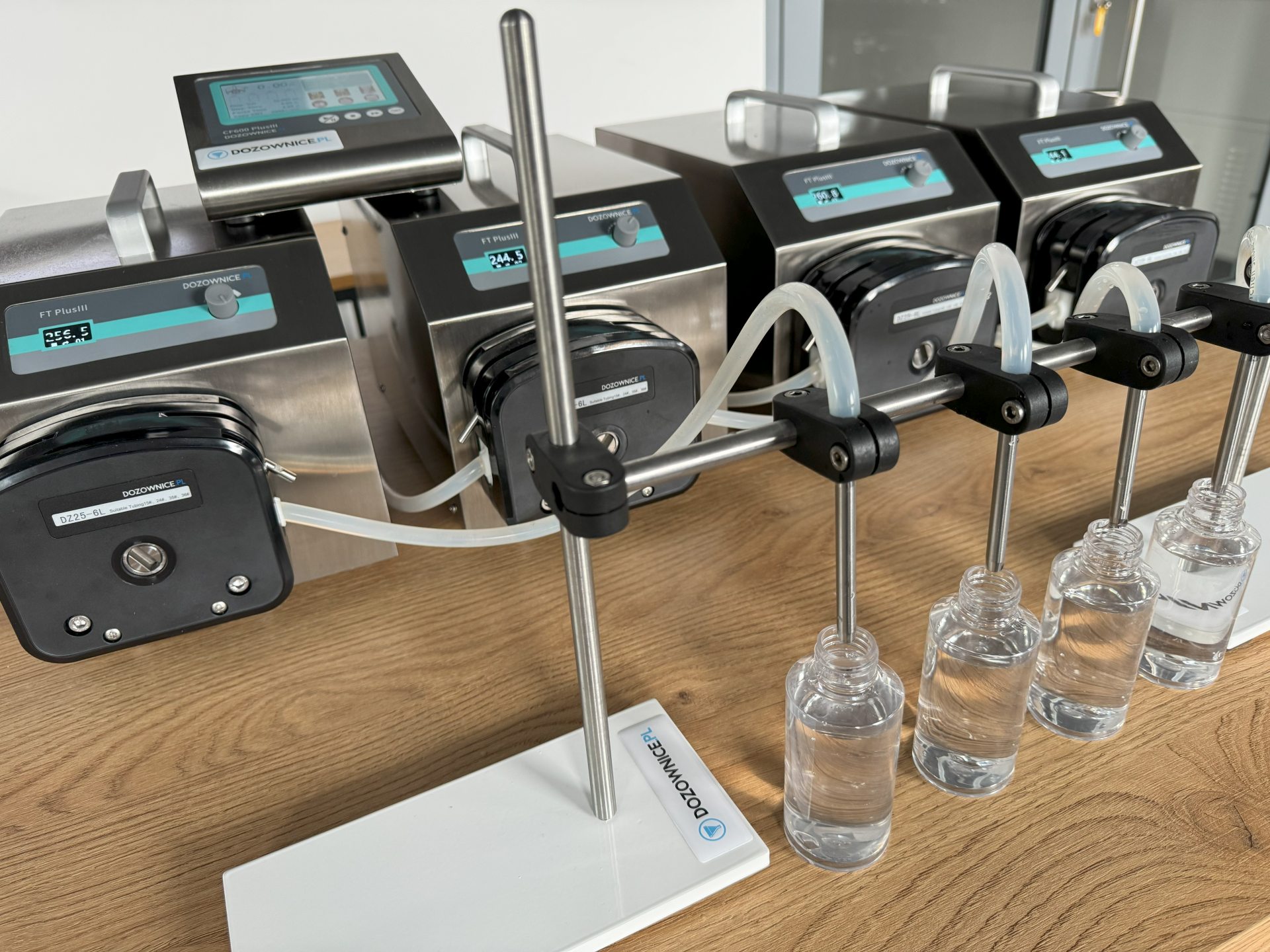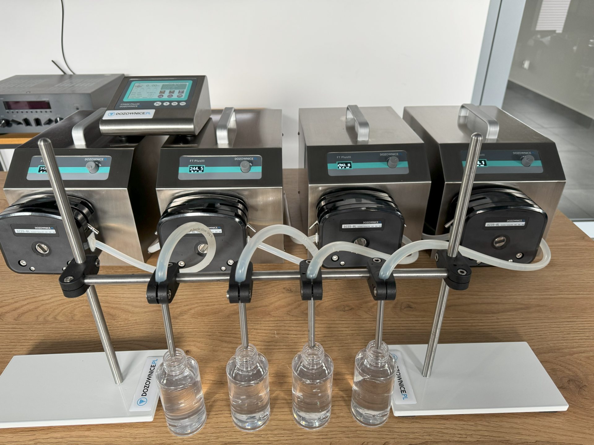 Model CF-8 to pompa perystaltyczna zaprojektowana dla zakładów, które oczekują szybkiego i powtarzalnego nalewania wielu porcji produktu jednocześnie. Dzięki 8 niezależnym pompom i możliwości rozbudowy do 16 głowic, urządzenie pozwala na równoczesne napełnianie dużej liczby butelek, znacznie zwiększając wydajność produkcji. Urządzenie zachowuje typową dla pomp perystaltycznych czystość pracy – ciecz przepływa wyłącznie przez wąż silikonowy.