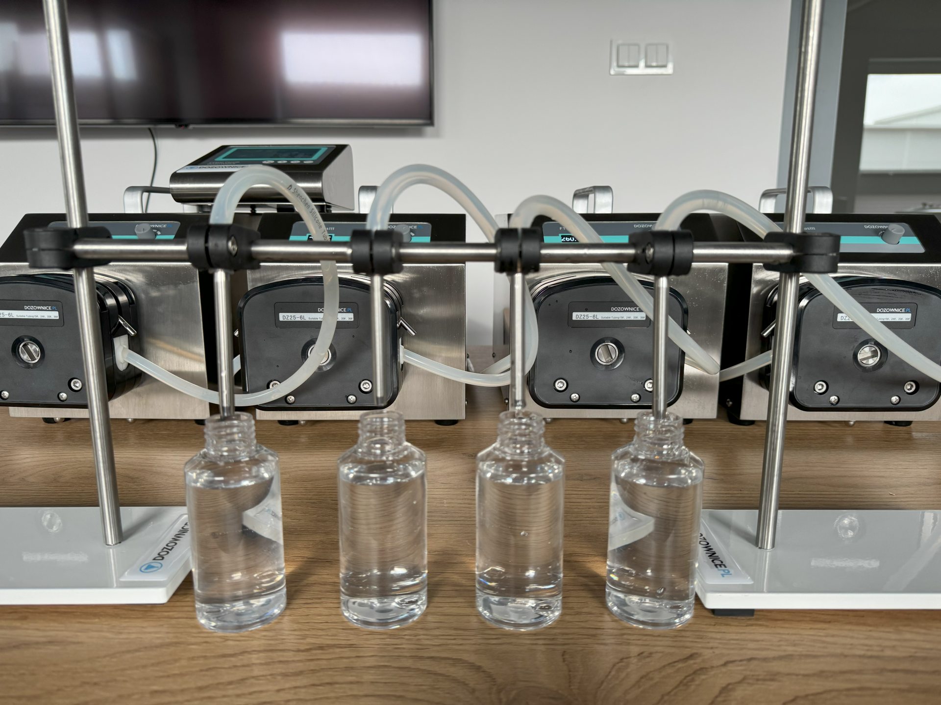 Pompa CF-8 znajduje zastosowanie w produkcji spożywczej (soki, syropy, sosy), kosmetycznej (kremy, balsamy, emulsje), farmaceutycznej (roztwory, syropy) oraz chemicznej (detergenty, płyny techniczne). Sprawdza się wszędzie tam, gdzie kluczowe są higiena procesu, powtarzalność i możliwość pracy na wielu butelkach jednocześnie.