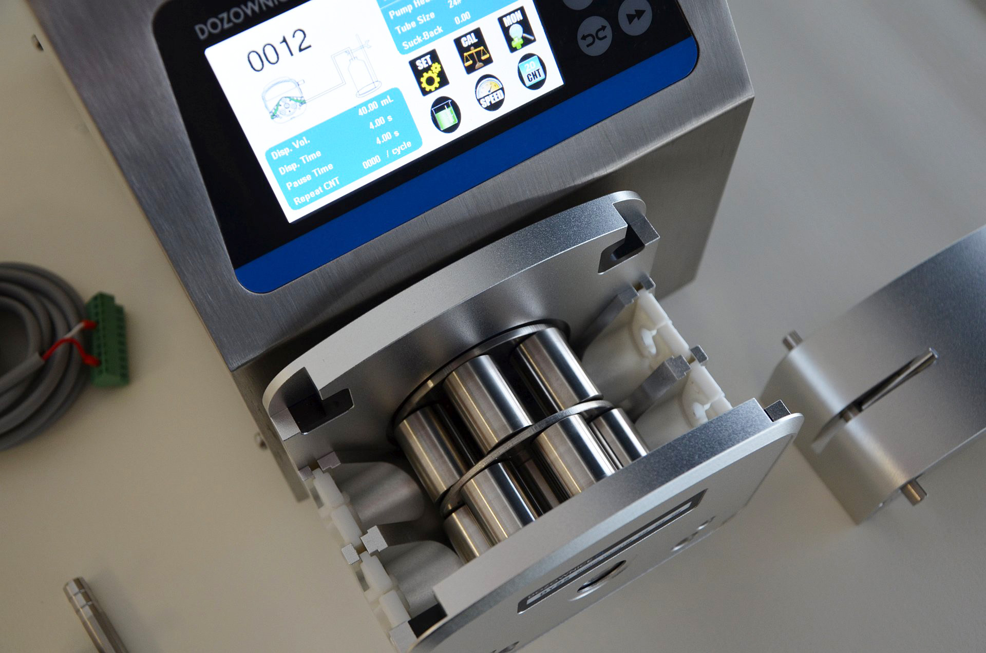 Pompa działa w trybie manualnym (pedał nożny) lub w pełni automatycznym – z zapisem programów (do 60), regulacją dozy, prędkości i przerw między nalewami. Możliwe wyzwalanie czujnikiem obecności butelki.